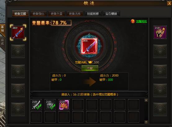 系统说明:装备觉醒系统是游戏的核心系统之一,可以消耗多余装备对装备部位进行觉醒,获得额外属性。勾选的材料装备越多,觉醒成功率越高。