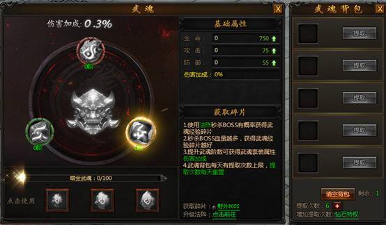 系统说明:武魂系统是游戏的核心系统之一,提高对所有目标的伤害。武魂有三个部位,三个部位的武魂达到指定等级后可激活套装属性,伤害百分比加成。武魂系统的升级材料为武魂碎片,武魂碎片的获取主要来自于法阵秒杀BOSS时掉落。