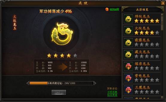 系统说明:龙玉系统是游戏的核心系统之一,降低PK时掉落军功的概率。龙玉系统的升级途径是达成成就活动成就经验。