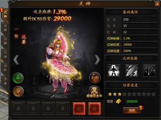 系统说明:式神是游戏中的核心系统之一,能力十分强大,可以单挑一切BOSS。式神是玩家新手期时,打BOSS的主要手段。将式神切换至主动攻击模式,让式神吸引BOSS,角色无需上前战斗,可让式神完成整个BOSS击杀过程。式神攻击BOSS时可以麻痹BOSS,BOSS被麻痹后无法移动,释放技能,此时玩家攻击BOSS即可无需担心受到高级BOSS的伤害。此外,式神觉醒之后,攻击速度提升50%,能够光速击杀BOSS。