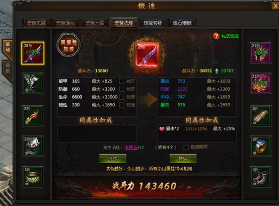 系统说明:装备洗炼系统是游戏的核心系统之一,洗炼可以对已有洗炼属性进行刷新,获得更高属性,多条相同的洗炼属性还能获得同属性加成。洗炼系统的材料为洗炼石,洗炼石的获取主要来自于个人BOSS和国家BOSS。