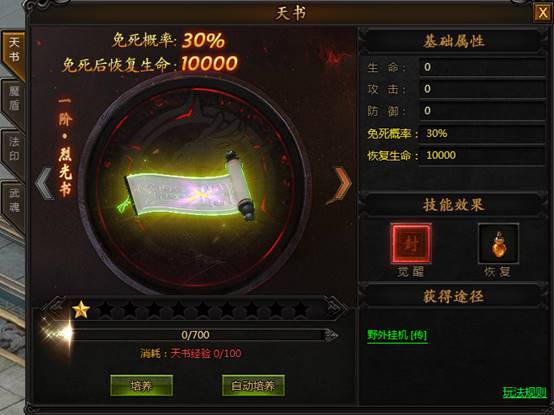 系统说明:天书系统是游戏的核心系统之一,在玩家受到致命伤害时可以免疫一次死亡并恢复血量。和其他玩家PK时无所畏惧。天书系统的升级材料为天书经验,天书经验的获取主要来自于日常任务挂机掉落。