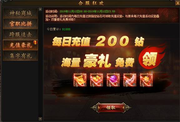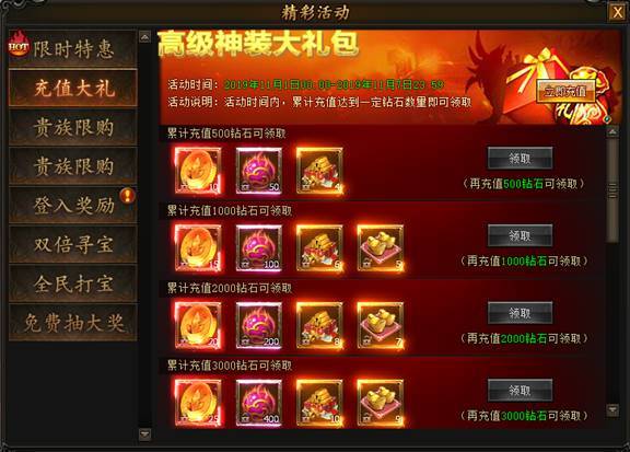 活动期间,充值元宝数量达到指定数额时,即可领取累充反馈奖励。