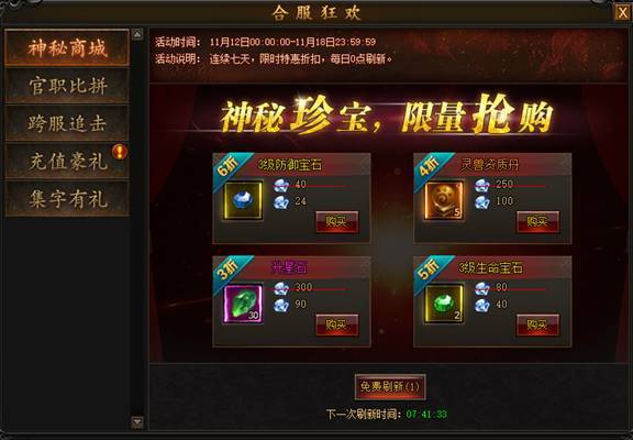 活动期间,神秘商城可刷出各种珍惜道具,超低折扣,限量抢购。